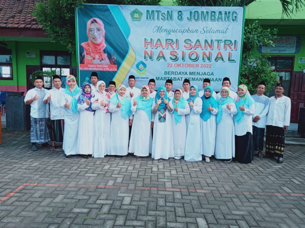 MTsN 8 Jombang (humas) – Hari Santri Nasional (HSN) diperingati setiap tanggal 22 Oktober di seluruh Indonesia. Tak terkecuali MTsN 8 Jombang juga mengadakan peringatan HSN, Sabtu (22/10/2022). Peringatan HSN tahun ini mengambil tema ” Berdaya Menjaga Martabat Kemanusiaan “. Pada peringatan HSN kali ini MTsN 8 Jombang mengadakan upacara bendera dan dilanjutkan dengan pawai sepeda hias keliling desa sekitar. Kegiatan ini bertujuan untuk mengajak para siswa untuk mengenang jasa para santri dalam perjuangan mempertahankan kemerdekaan Negara Republik Indonesia.